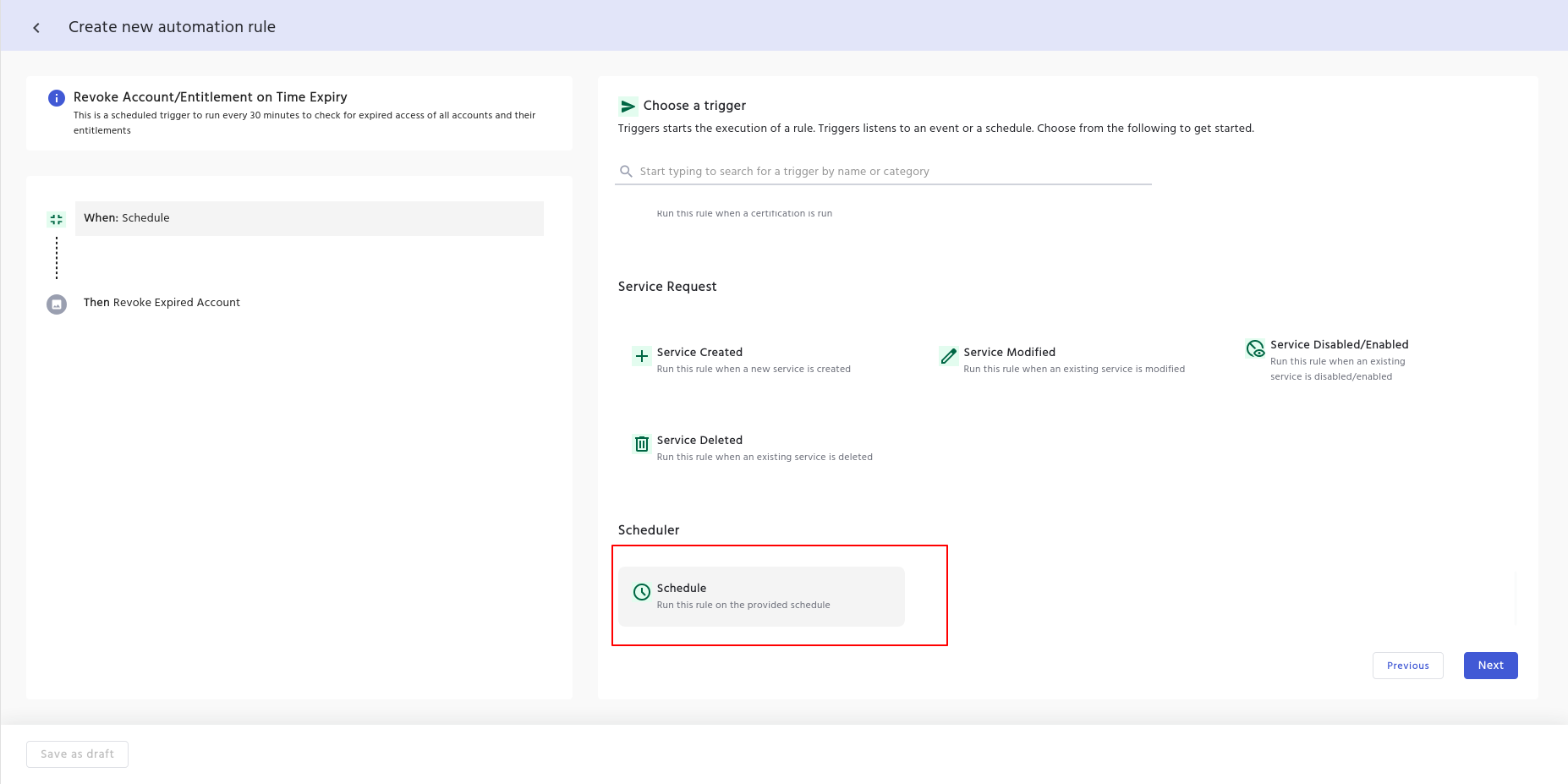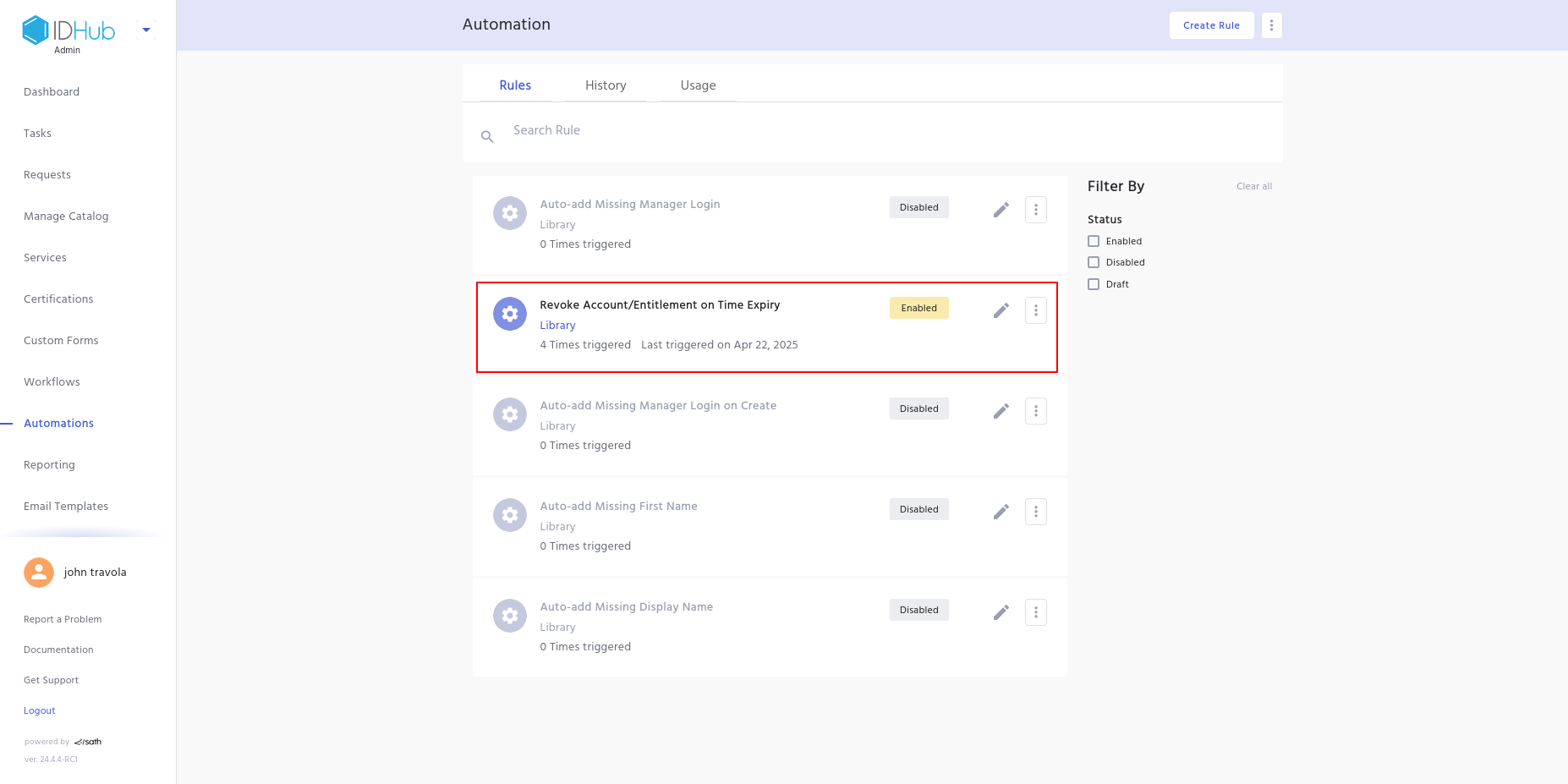 4. Scroll to the Revoke Account/Entitlement on Time Expiry entry in the Automation Library. By default, this rule is Disabled.