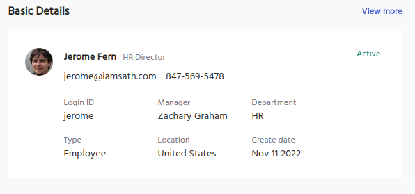 This provides basic profile information such as Login ID, Type, Department, create date, Manager, and Location.