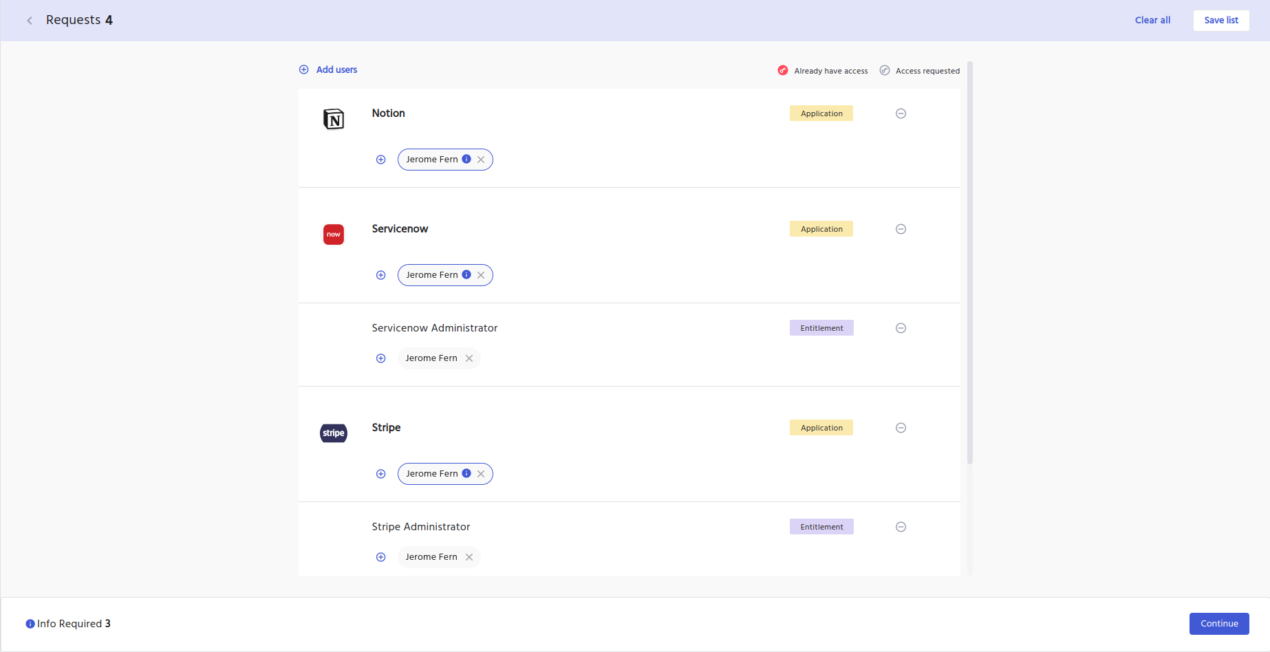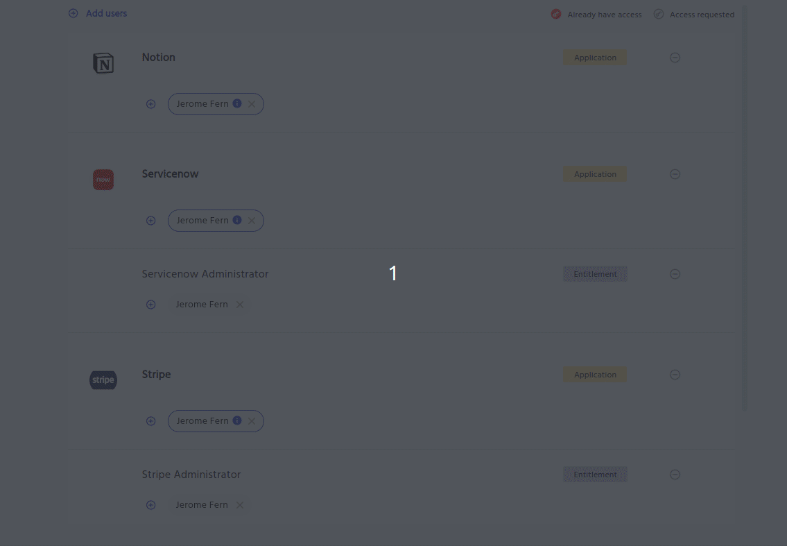 In this case, you would have to click on the small plus icon for those items in the cart, enter the name of the user for which you want to request access and then click on the done button as is shown in the screenshot below: