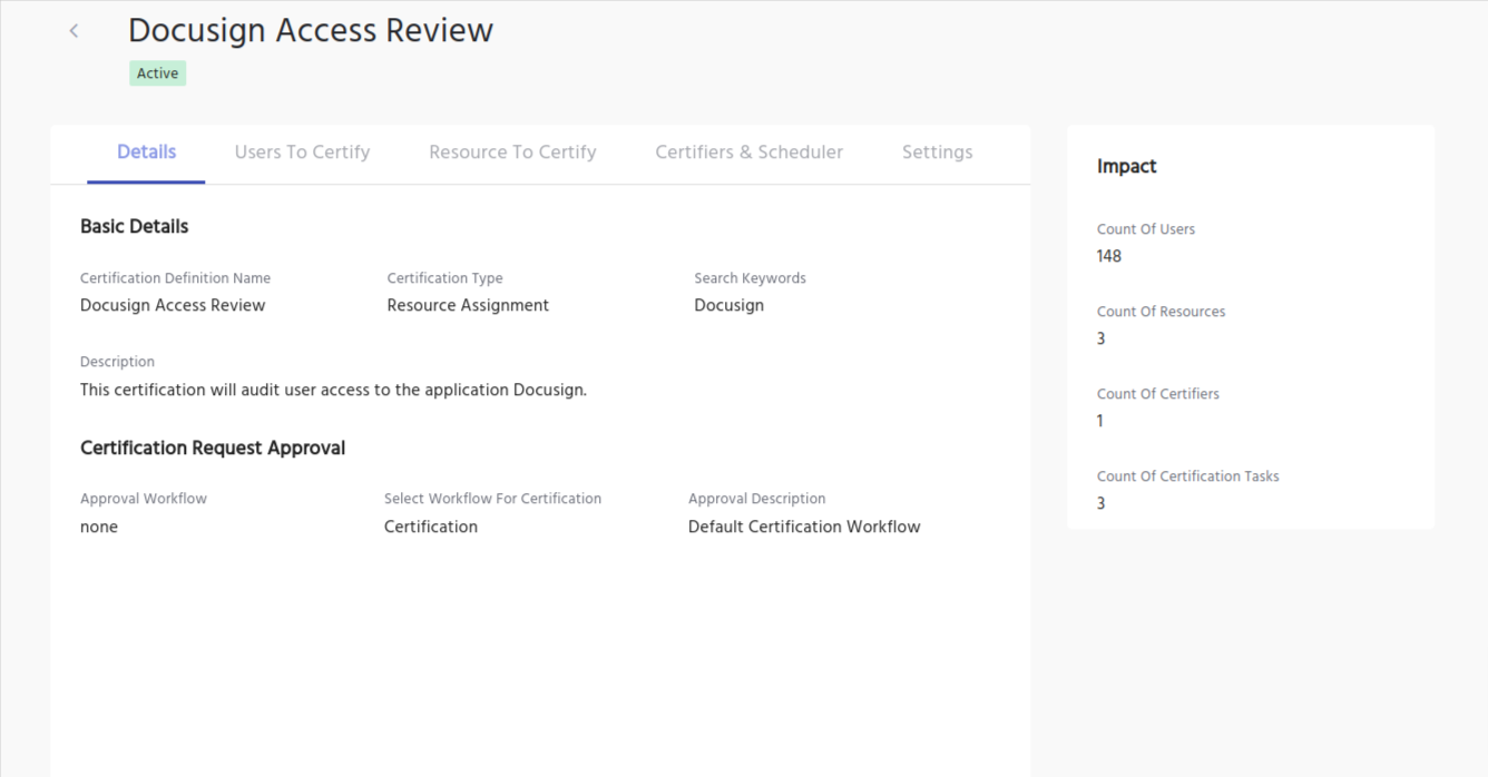 The details page of the certificate will provide details of the certification definition in a view read only format. The following information would be included in the page: