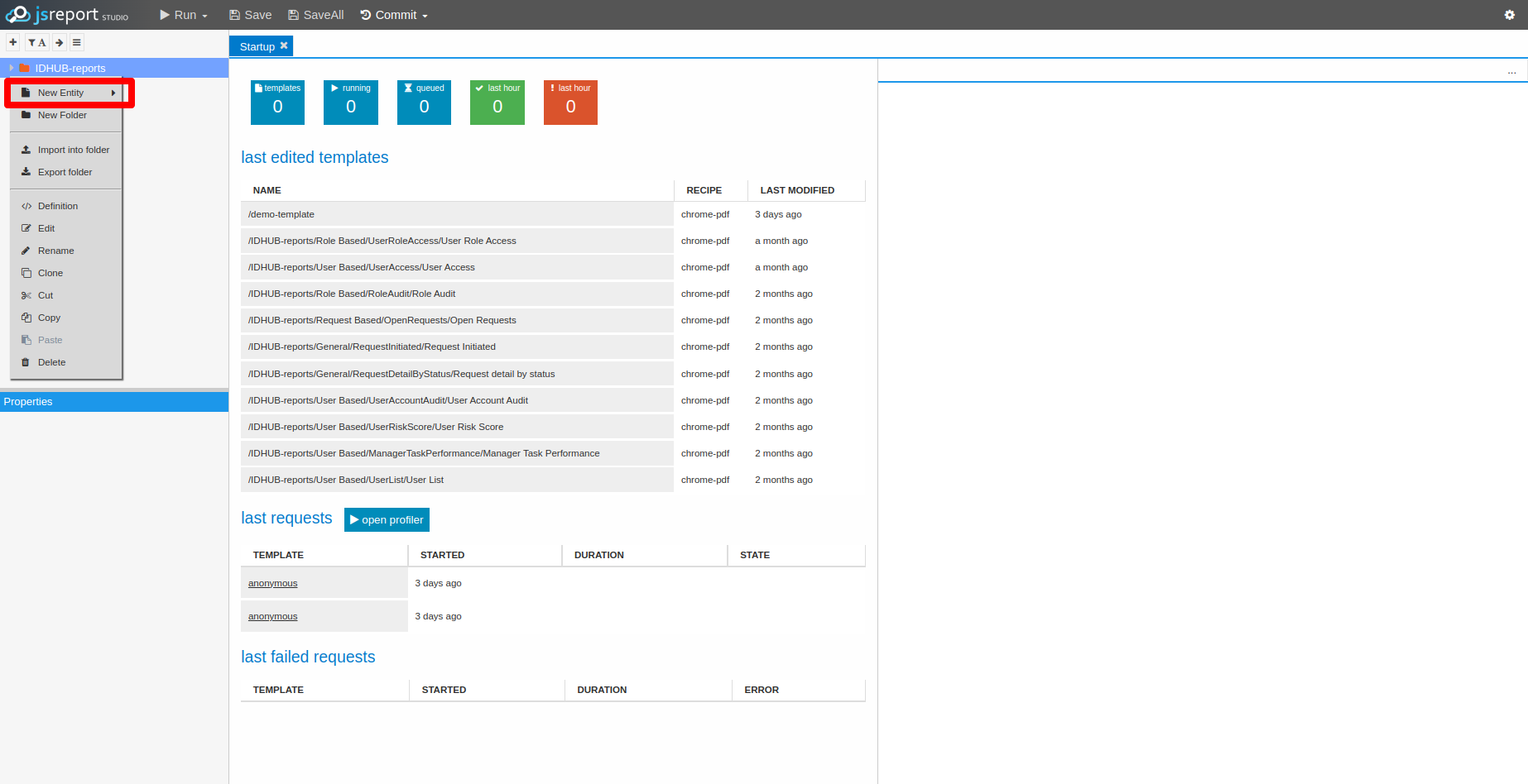 Then you will need to right click on the IDHub reports in the left hand, you will see a content menu. In the menu you will need to click on the “New Entity” and then “Template